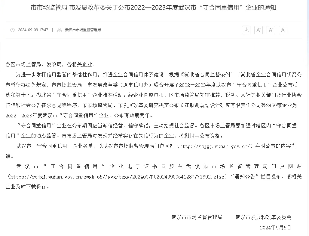 此次“守合同重信用”企业评选活动由武汉市市场监管局、市发展改革委联合开展,涉及税务、人社等多个相关部门及行业协会的征信和社会公示征求意见等多重程序,是对企业信誉状况和合同管理水平的认定,也是企业信誉重要的评价证明,旨在完善市场主体的信誉体系,推进企业合同信用体系建设,营造良好的市场经济秩序,每两年开展一次,公布期为两年。