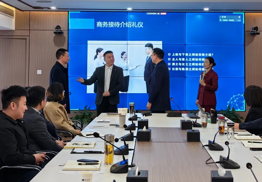 实战演练环节特别设置"商务场景通关挑战",模拟商务接待、商务谈判、商务称呼、商务汇报等真实工作场景。采用"现场纠偏-即时练习-复盘巩固"闭环式学习,现场抽取参训学员开展全流程演练,加深了大家对不同场景下常用的商务礼仪知识的认知和运用,让参训学员切实感受到礼仪规范的专业价值。